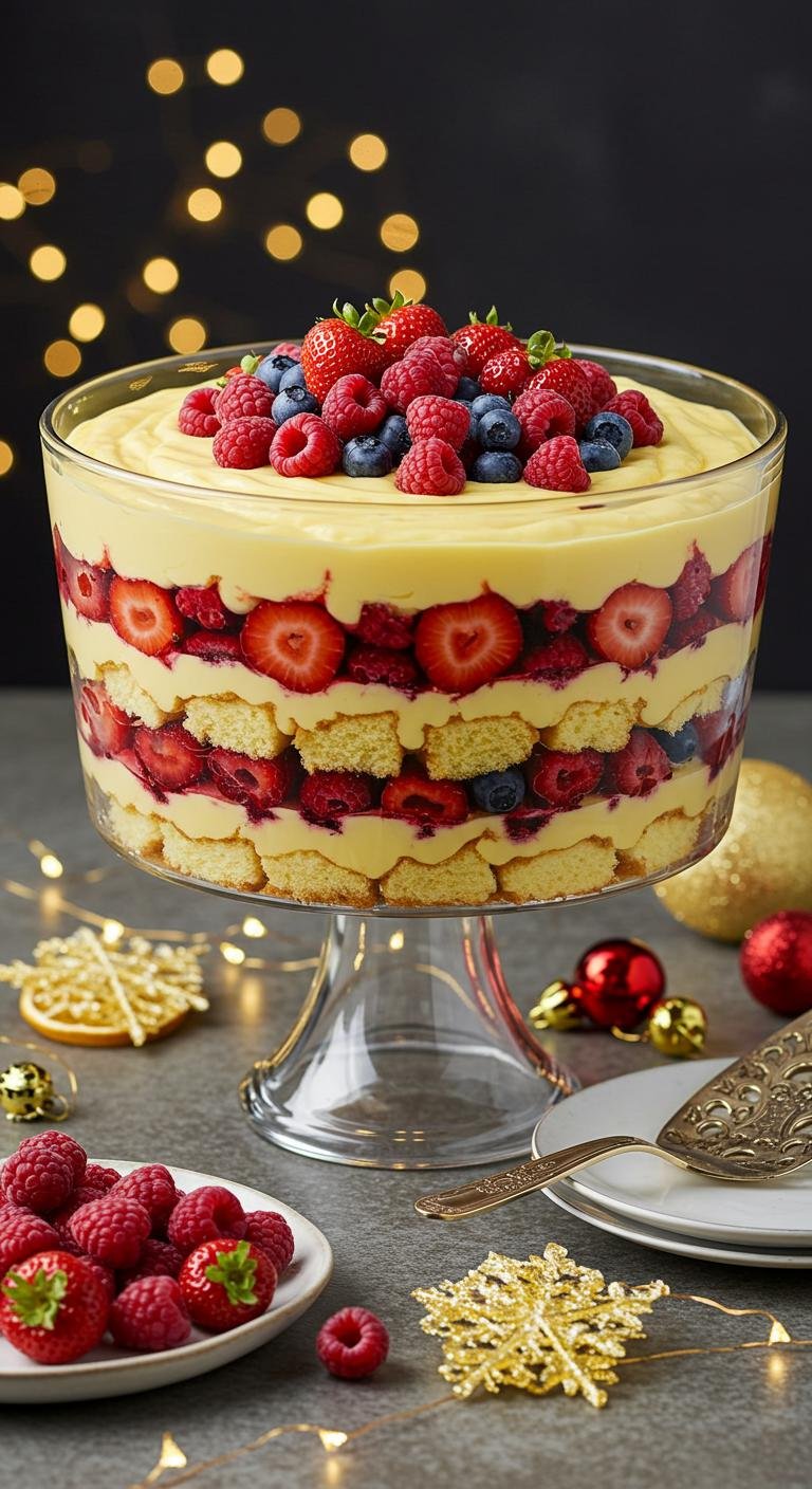 - Layer cubed pound cake, custard, and berries in a trifle dish.