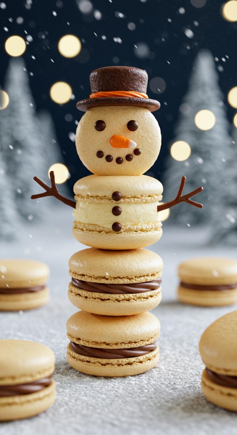 - Cool, then fill with buttercream and stack three macarons for snowman shape, adding decorations.