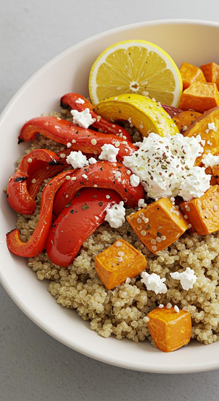 - Combine cooked quinoa and roasted veggies in a bowl.