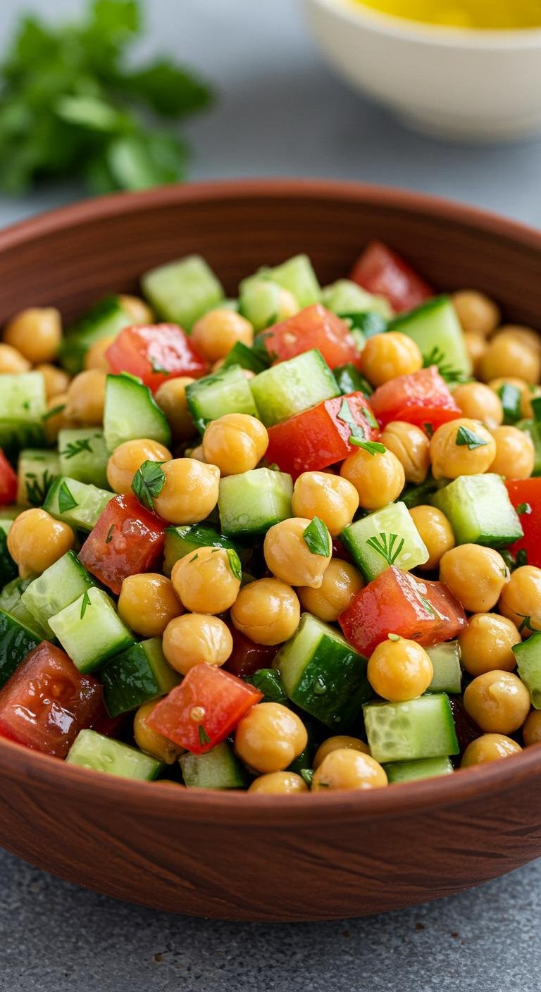 - Combine chickpeas, cucumber, and tomatoes in a bowl.