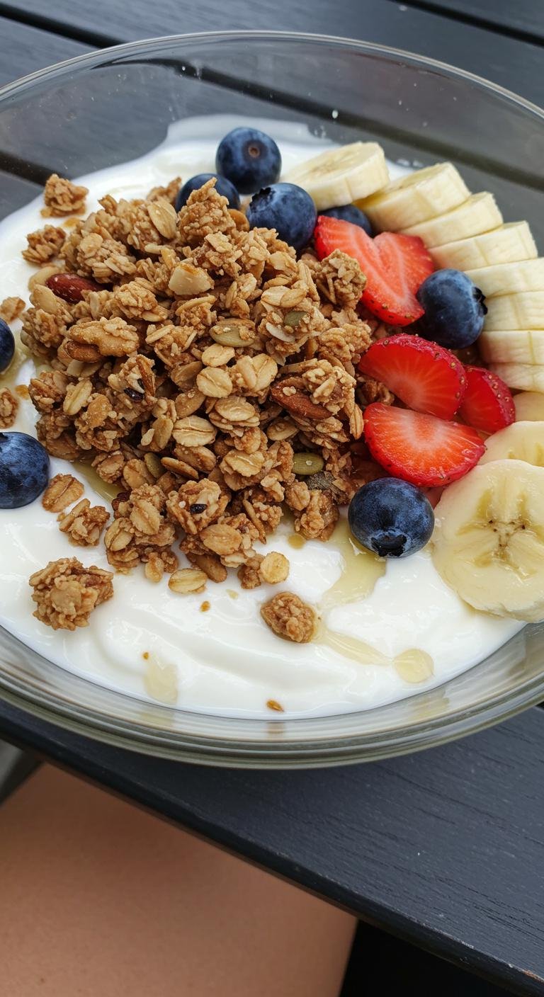 - Layer Greek yogurt and granola in a bowl.