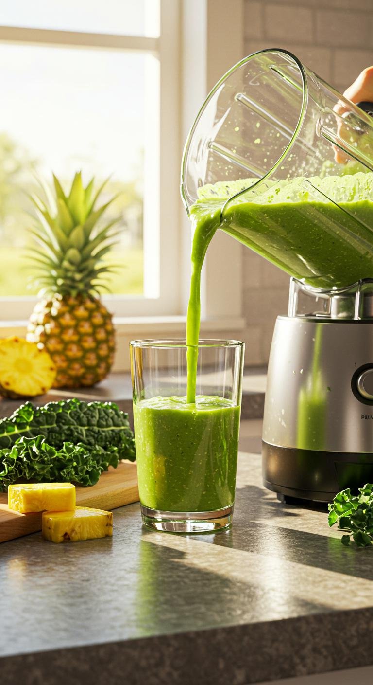 - Blend kale and pineapple with coconut water until smooth.