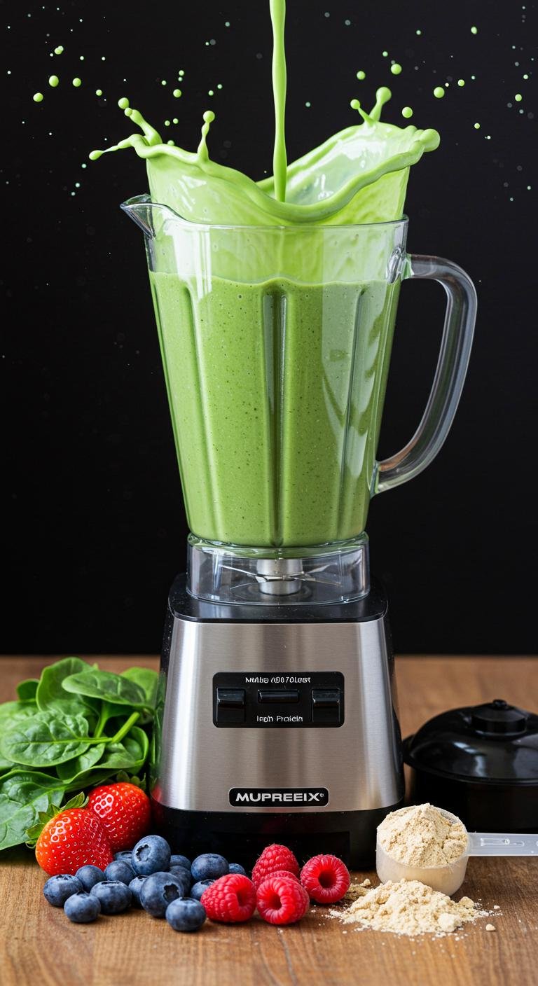 - Blend berries, spinach, protein powder, and almond milk until creamy.