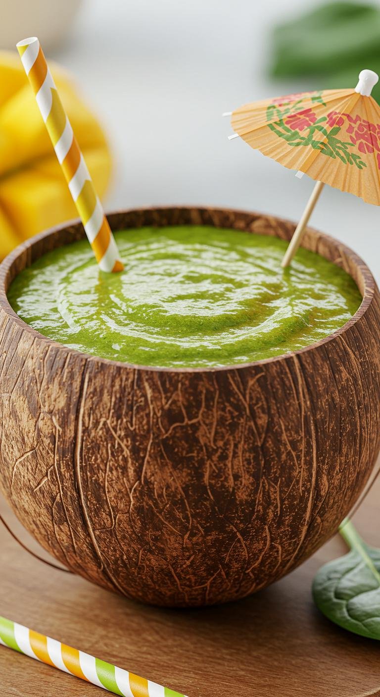 - Blend mango, spinach, banana, and coconut water until smooth.