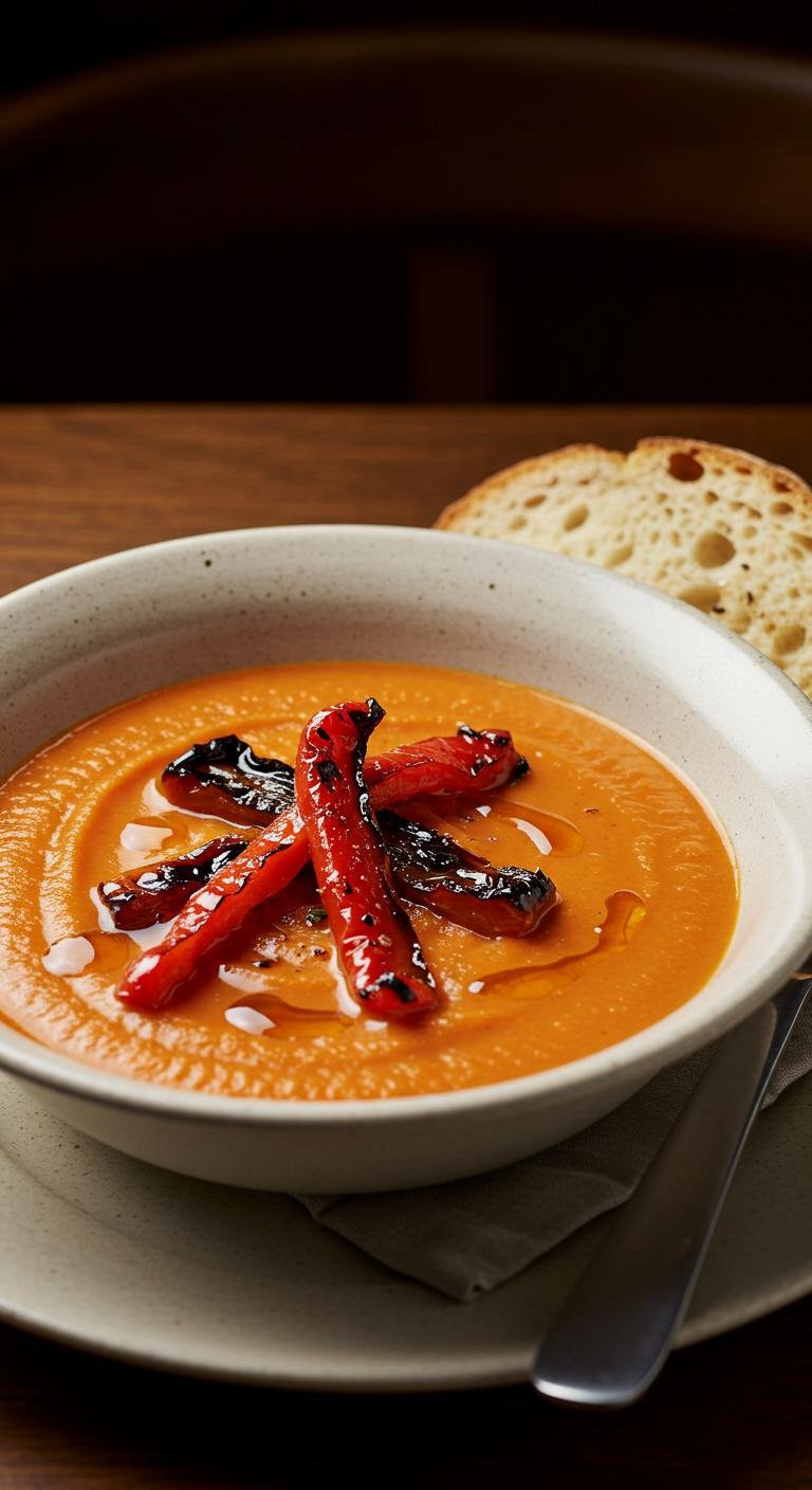 - Purée roasted peppers with tomatoes and broth until smooth.