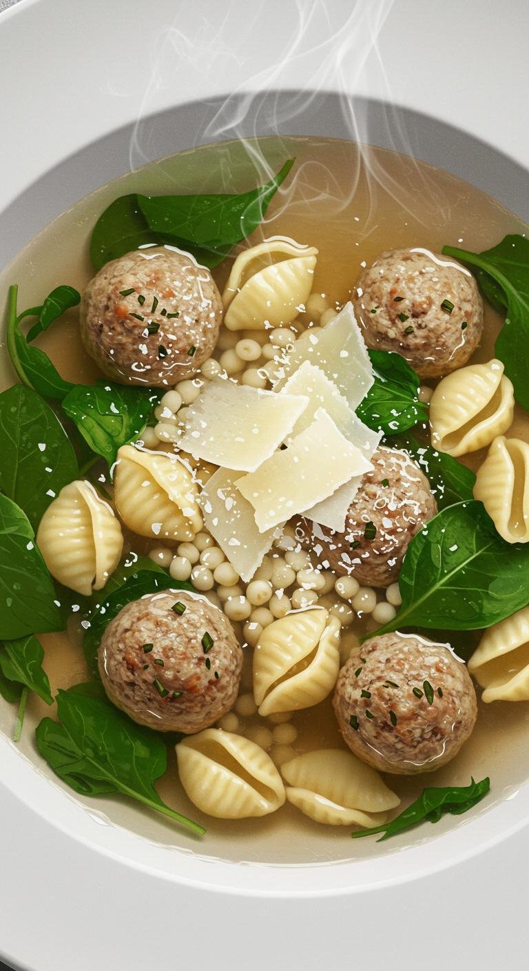 - Cook meatballs in broth until done, then add pasta and spinach.
