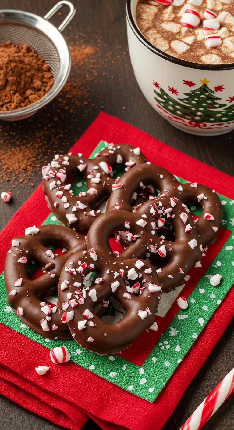 - Dip pretzels and sprinkle with candy canes.