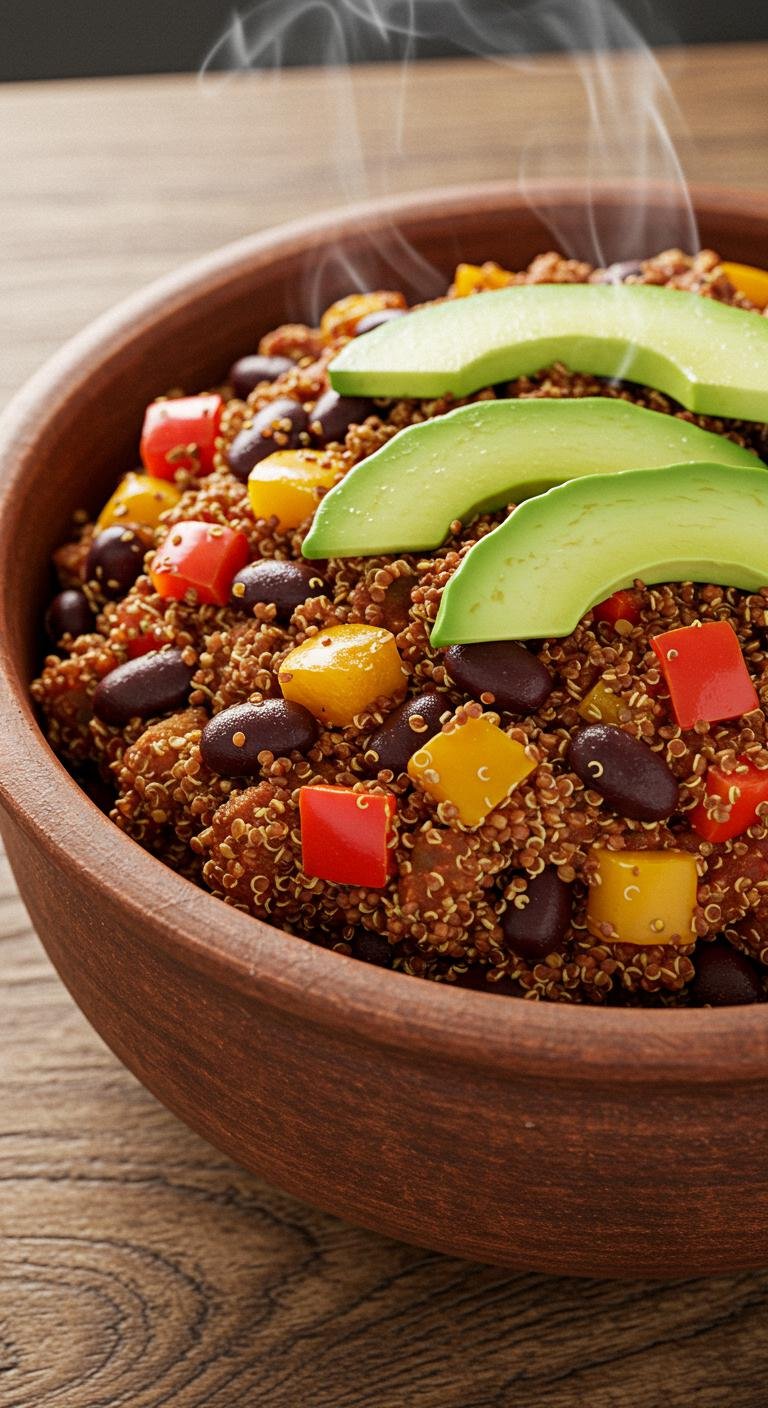 - Add quinoa, beans, tomatoes, pepper, and spices to the pot.