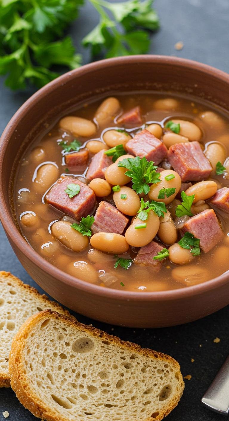 - Add ham, beans, and broth; simmer for 30 minutes.
