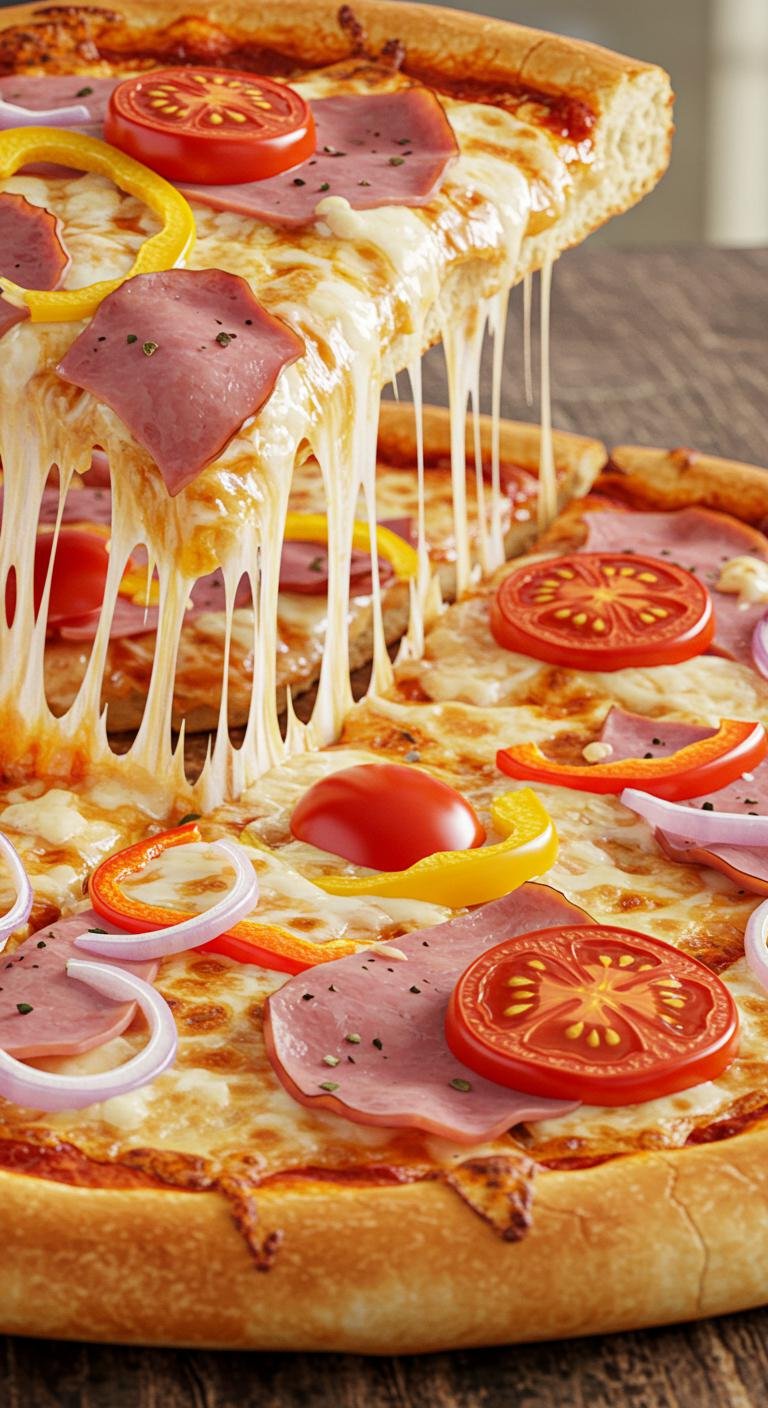 - Spread sauce on crust, add ham and toppings, and sprinkle cheese on top.