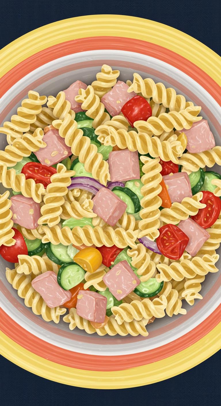 - In a large bowl, combine pasta, ham, tomatoes, and cucumbers.