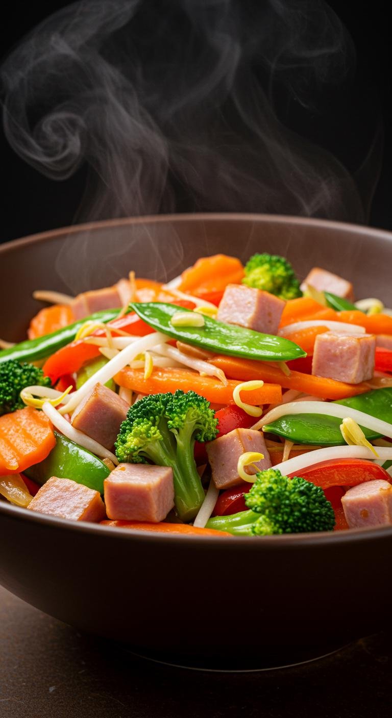 - Sauté garlic, then add vegetables and ham; stir-fry until tender.