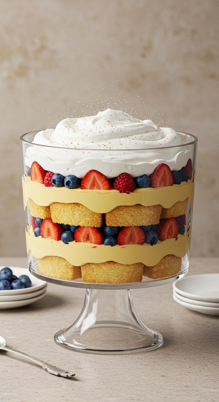 - Layer sponge cake, berries, and custard in a trifle dish.
