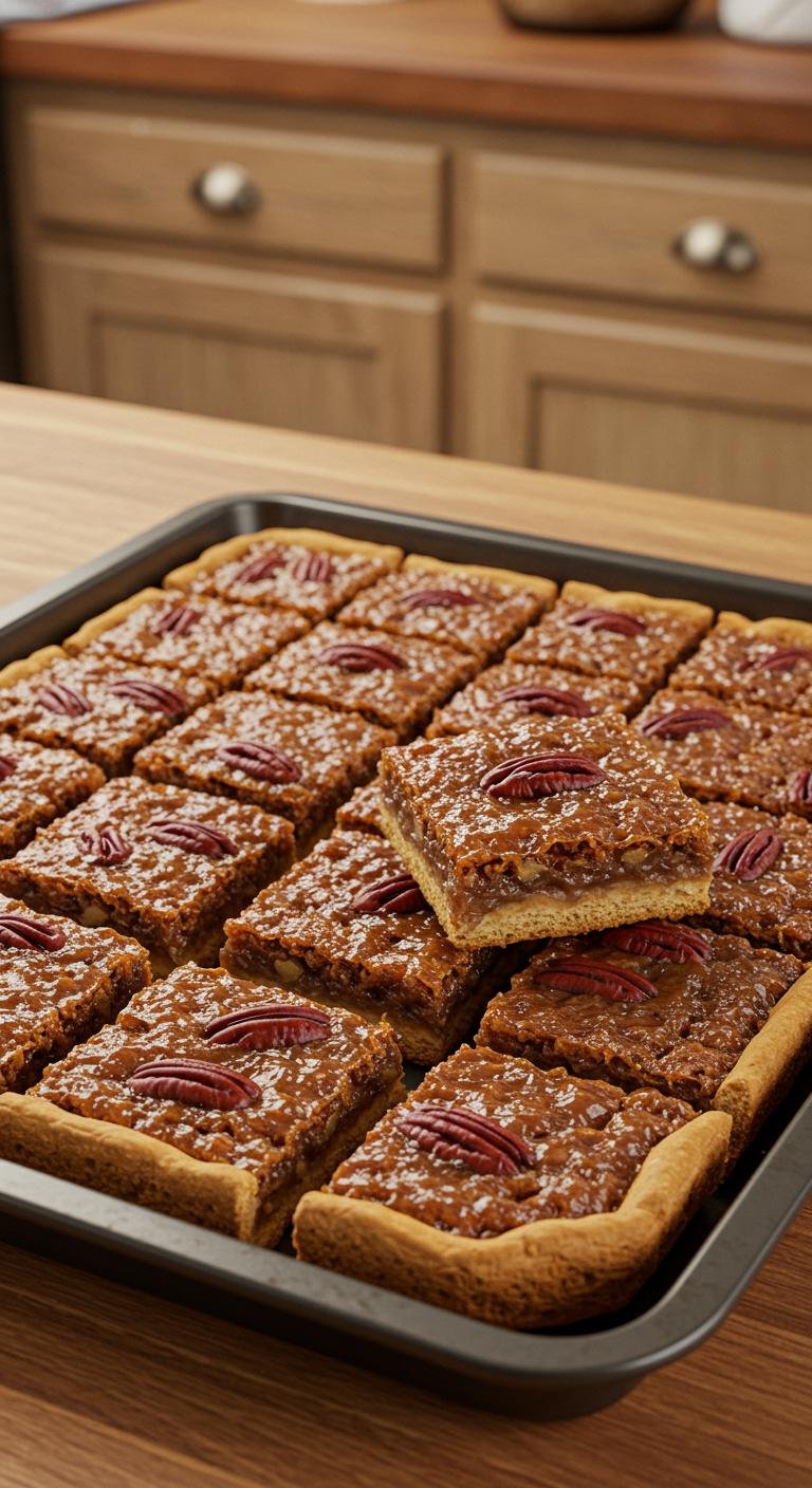 - Mix pecans, corn syrup, and eggs; pour over base and bake for 30-35 minutes.