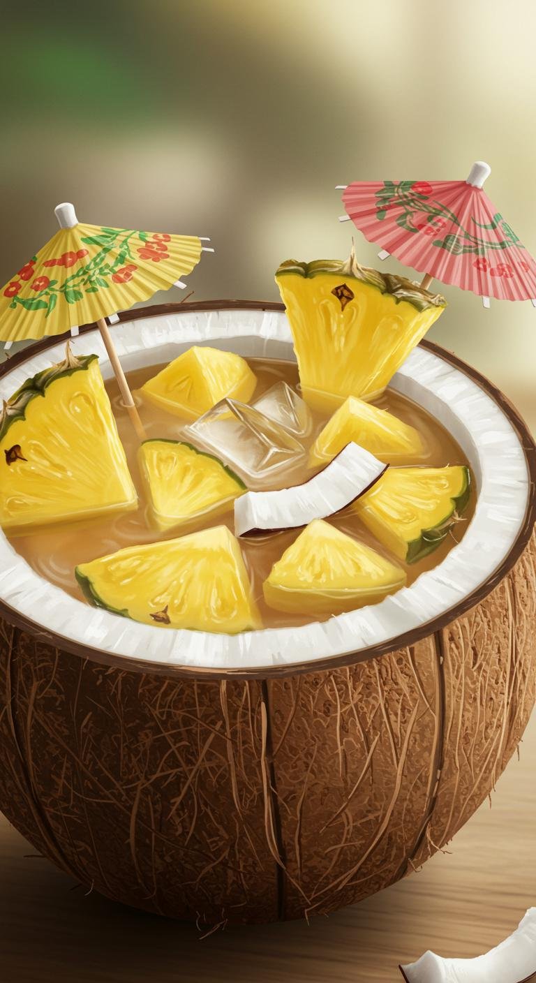 - Garnish with pineapple and coconut.