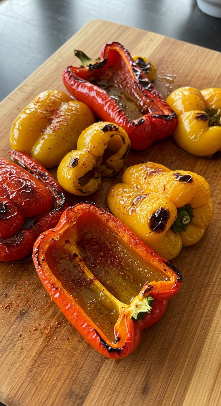 - Cut peppers into strips and toss with olive oil, paprika, and salt.