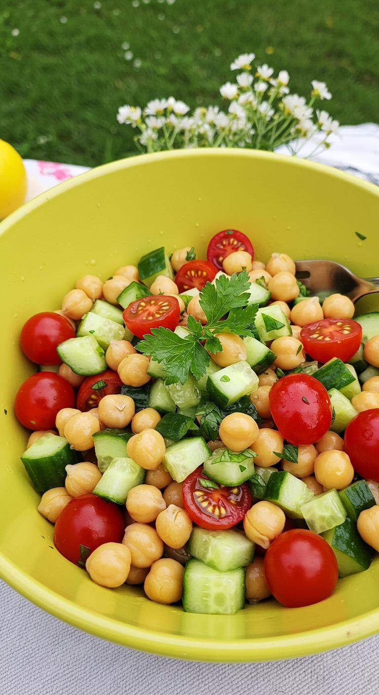 - In a bowl, mix chickpeas, cucumbers, and tomatoes.