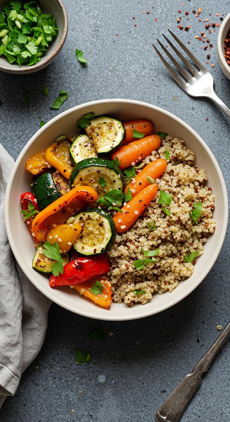- Combine roasted veggies with quinoa in a bowl and garnish with basil.