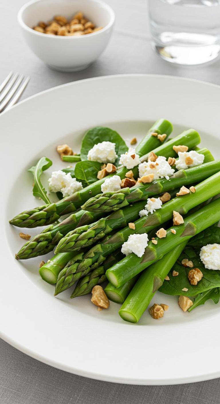 - Toss asparagus with olive oil, lemon juice, salt, and pepper; add goat cheese and walnuts.