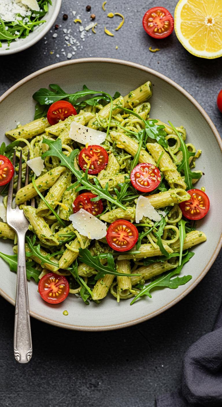 - In a large bowl, combine pasta, pesto, cherry tomatoes, and arugula.