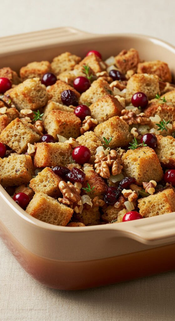- Mix bread, cranberries, walnuts, sautéed mixture, and broth in a bowl.