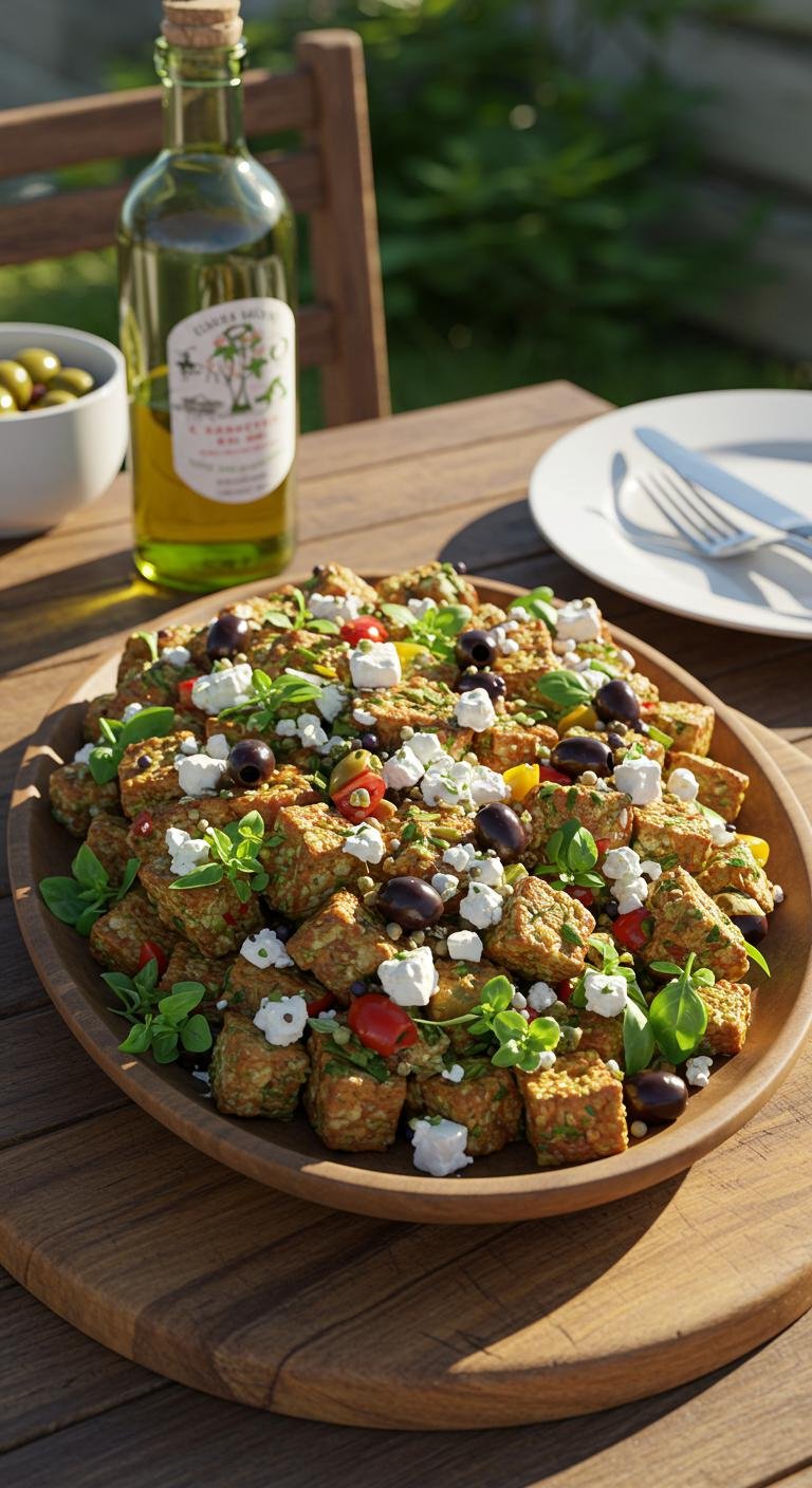 - Mix bread, olives, tomatoes, feta, and basil in a bowl.