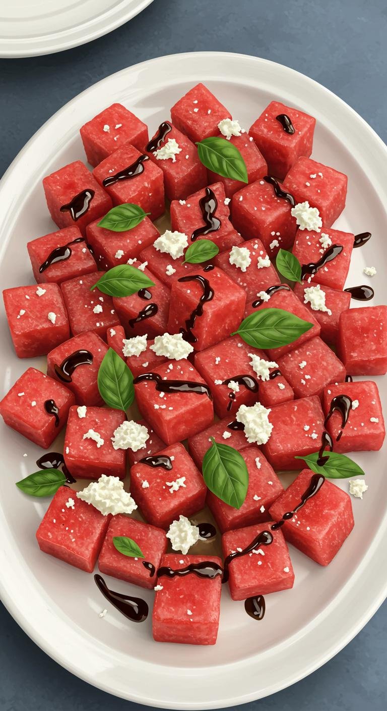 - In a large bowl, combine watermelon cubes, feta, and basil.
