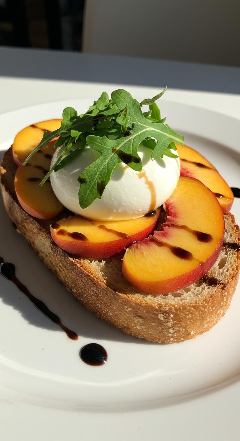 - Layer peach slices and burrata on top; garnish with arugula.