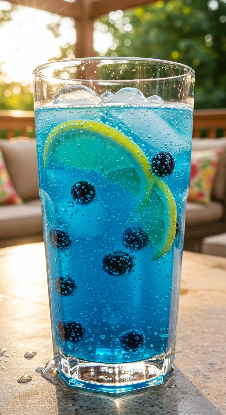 - Fill a glass with ice, add vodka, blueberry syrup, and lemonade; stir well.