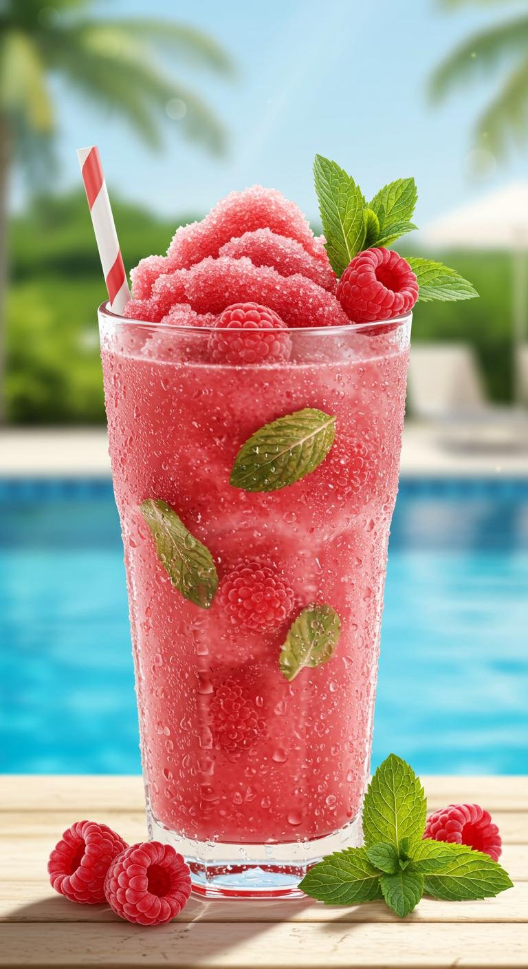 - Blend the raspberries, rum, lime juice, mint, and ice until slushy.