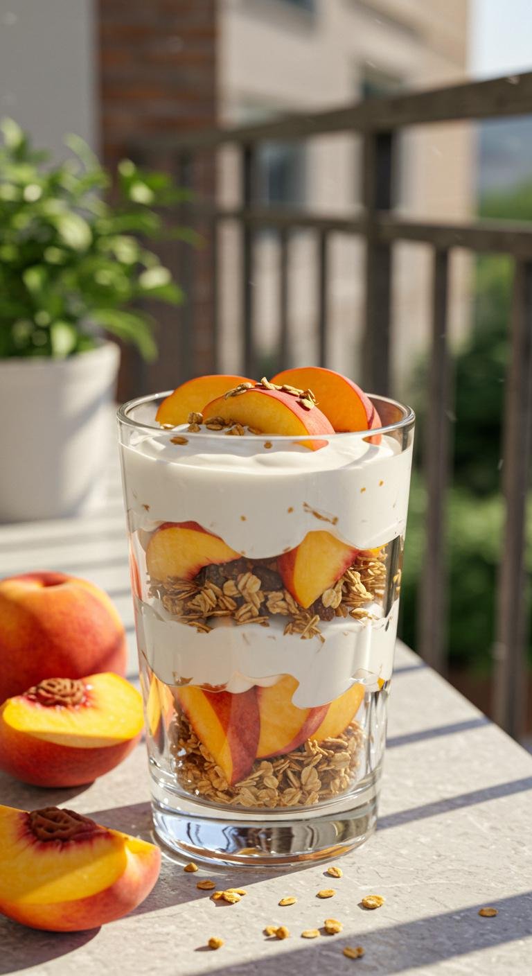 - Layer yogurt, granola, and peaches in a glass.