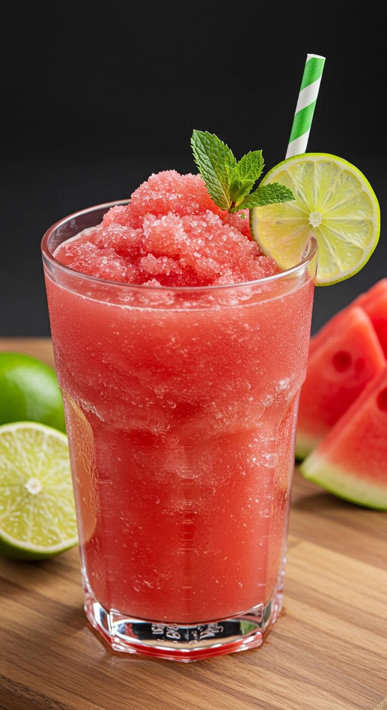 - Blend watermelon cubes, lime juice, honey, and ice until smooth.