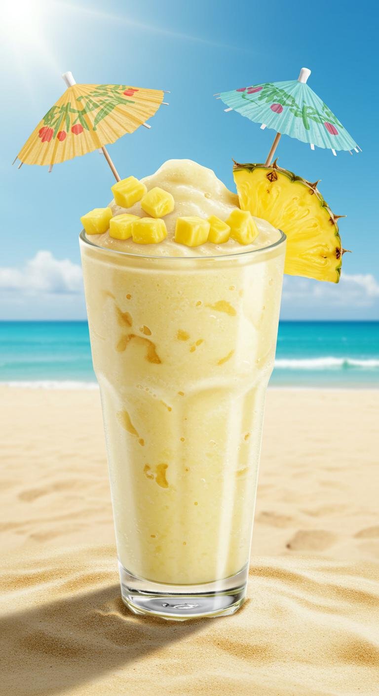 - Blend frozen pineapple, banana, coconut milk, and ice until creamy.