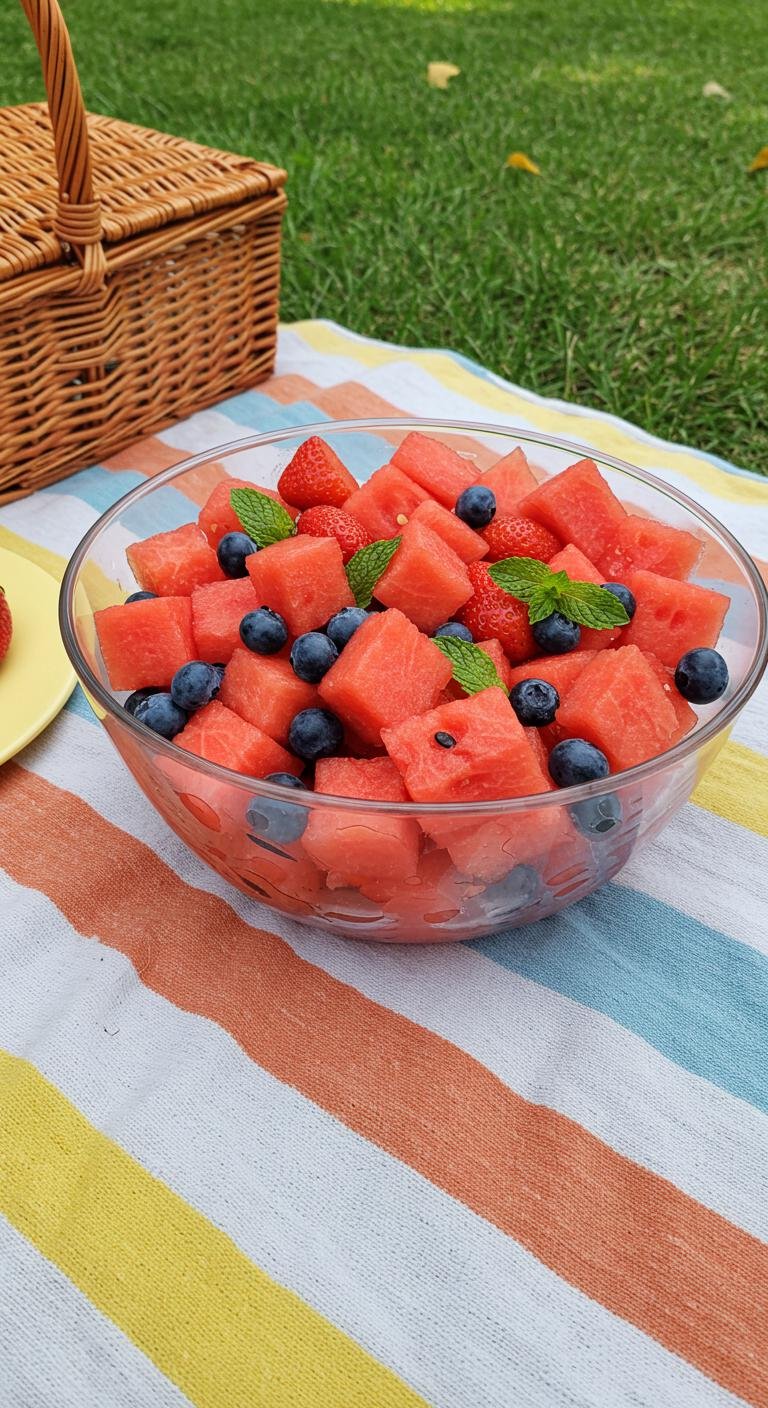 - In a large bowl, combine watermelon, strawberries, and blueberries.