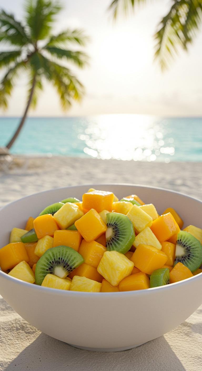 - Mix mango, pineapple, and kiwi in a bowl.