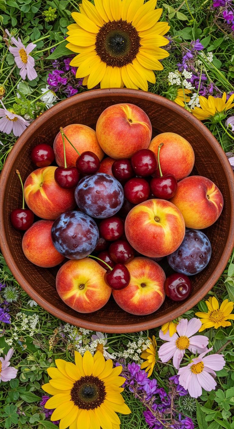 - Mix cherries, peaches, and plums in a bowl.