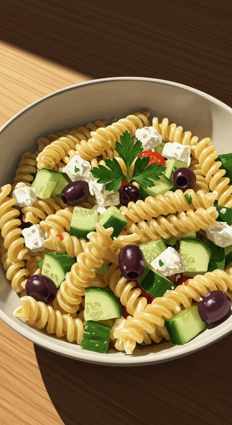 - In a large bow, mix the pasta with cucumbers, tomatoes, olives, and feta.