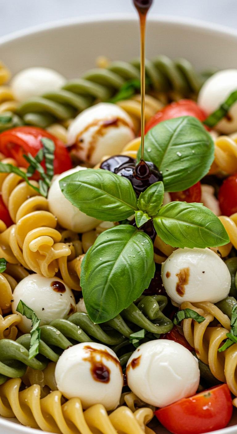 - Drizzle balsamic reduction and olive oil over the mixture. Season with salt and pepper, and toss.