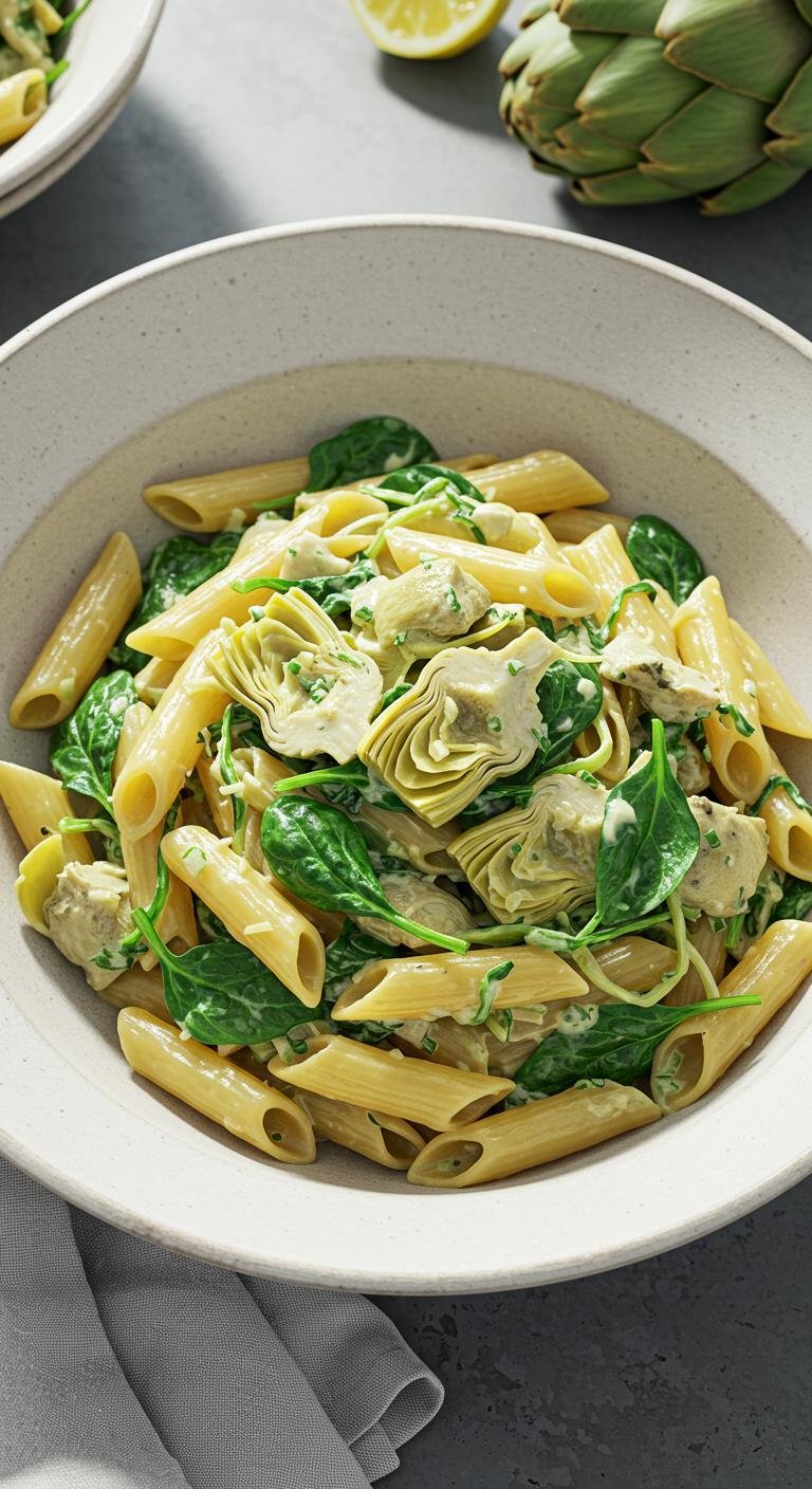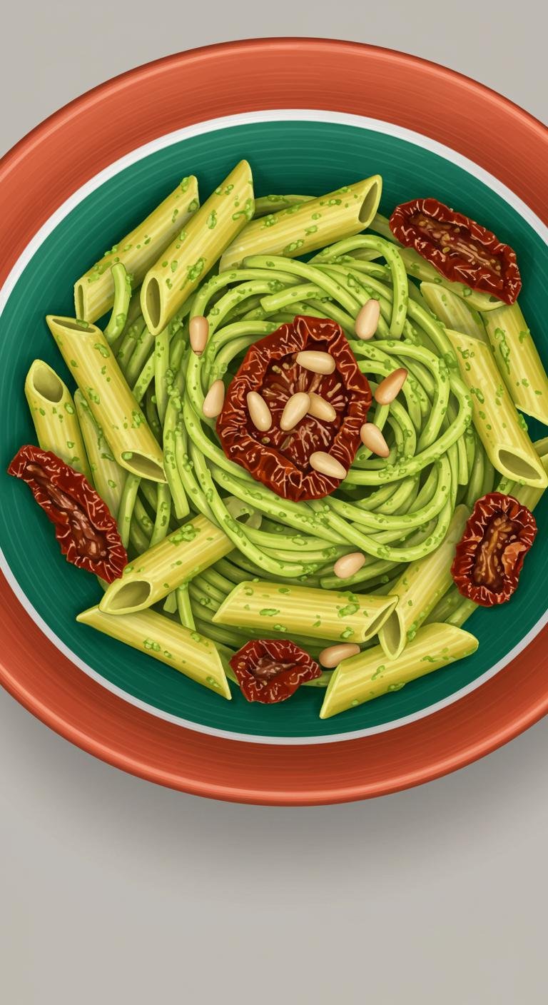 - In a bowl, mix pasta with pesto, sun-dried tomatoes, and pine nuts.