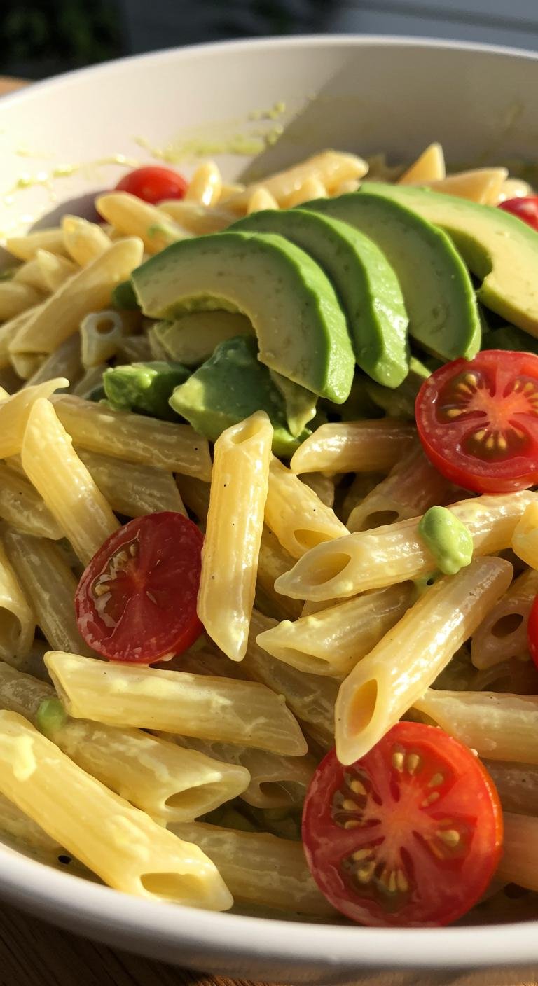 - Mix pasta with avocado dressing and cherry tomatoes.