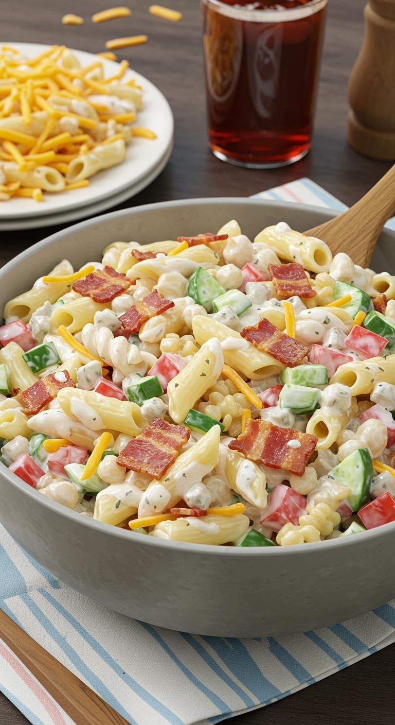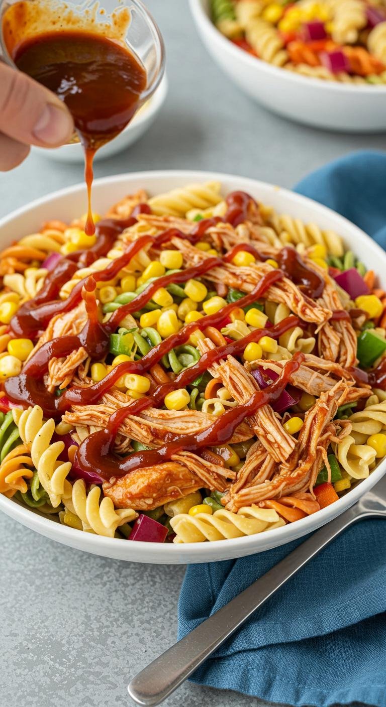 - Mix pasta with chicken, corn, bell peppers, BBQ sauce, and ranch dressing.