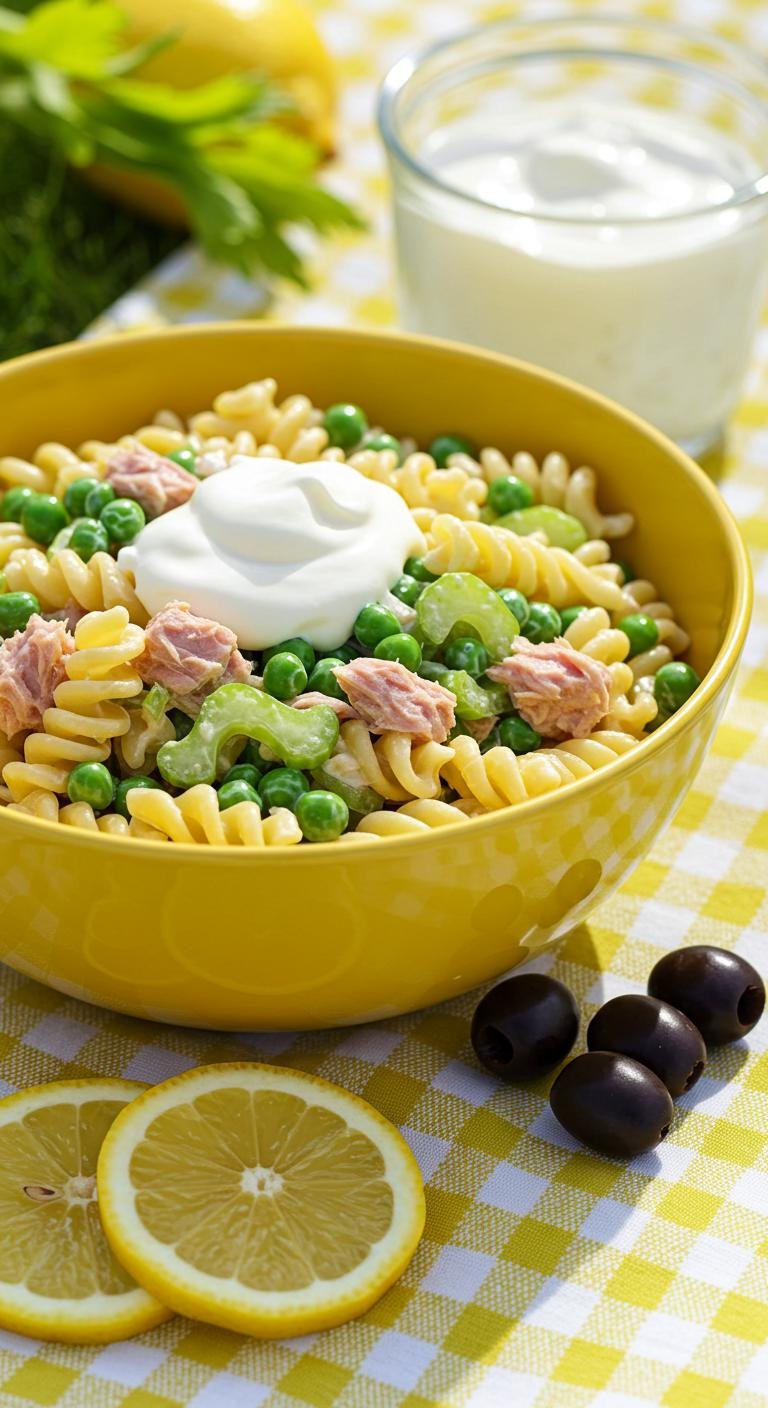 - Mix pasta with tuna, peas, celery, mayonnaise, salt, and pepper.