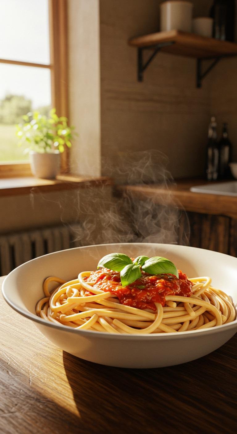 - Cook bucatini and mix it with sauce and basil.